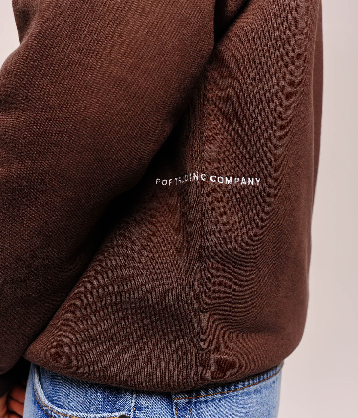 white embroidered script logo on left side